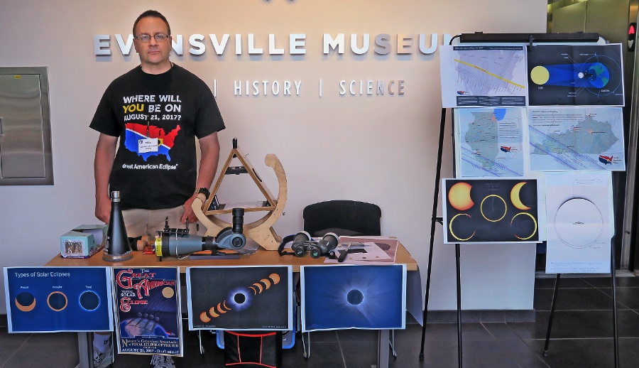 Leading up to the eclipse, EAS members did many eclipse programs, displays, TV & newspaper interviews, and safe solar viewing sessions at libraries (Dubois, Newburgh,and Alexandrian in Posey County), the Patoka Lake Nature Center, at the meeting of The North Central Region Of The Astronomical League, many schools in the area, and the Evansville Museum. Here are a few pictures from these events. |
