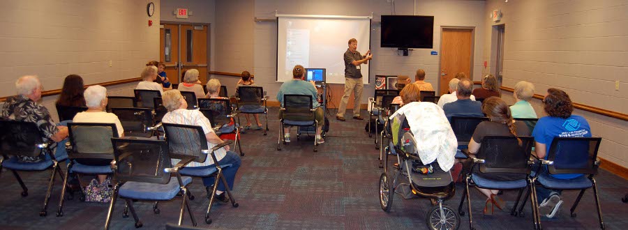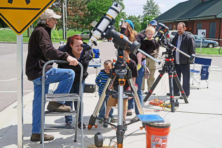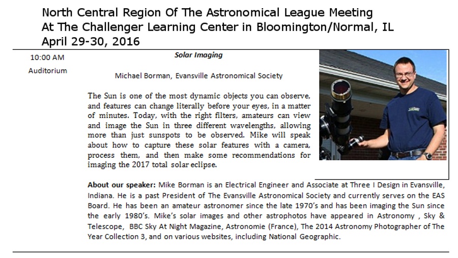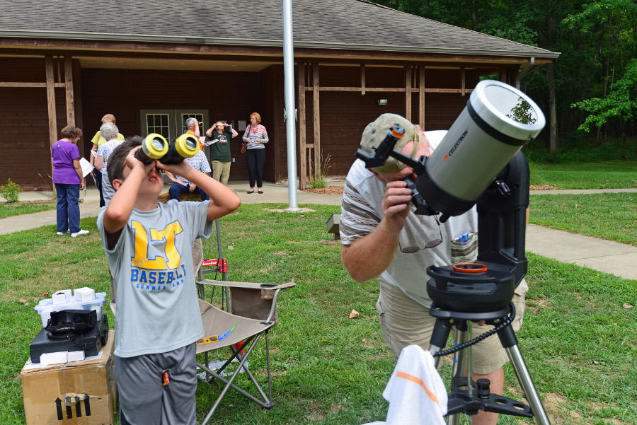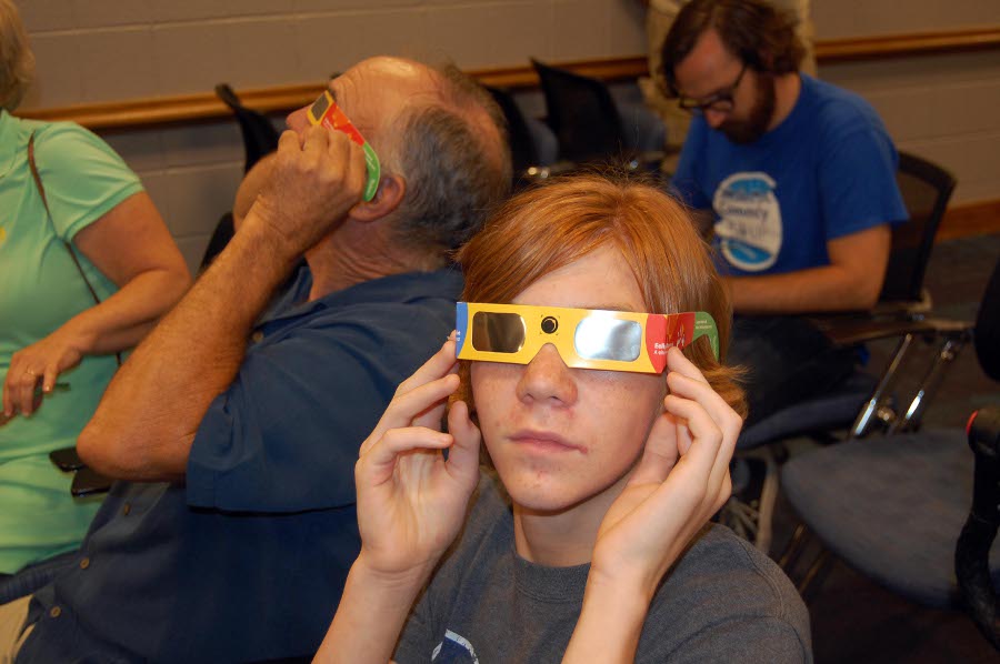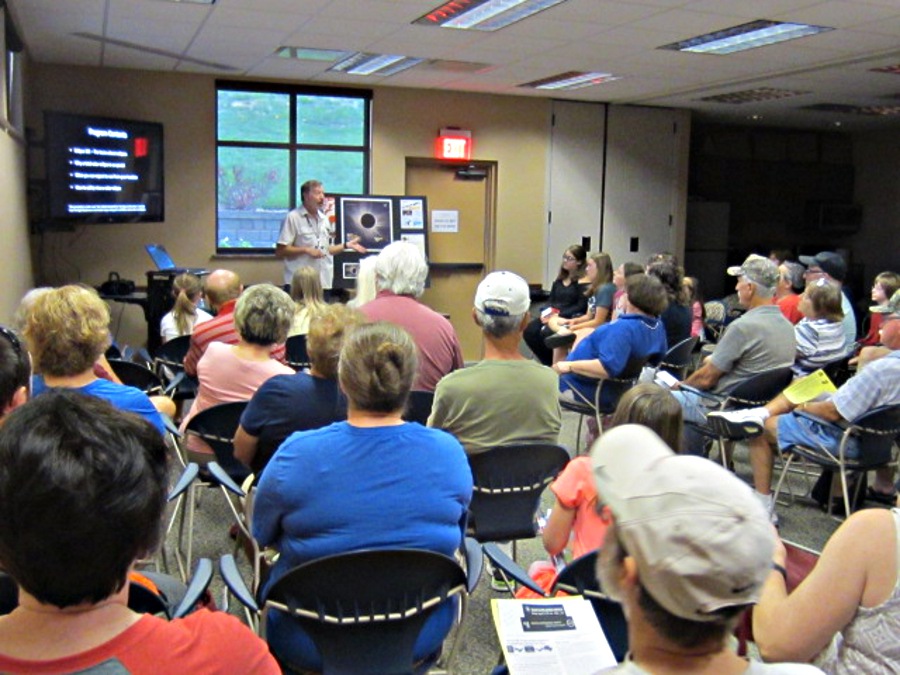 Leading up to the eclipse, EAS members did many eclipse programs, displays, TV & newspaper interviews, and safe solar viewing sessions at libraries (Dubois, Newburgh,and Alexandrian in Posey County), the Patoka Lake Nature Center, at the meeting of The North Central Region Of The Astronomical League, many schools in the area, and the Evansville Museum. Here are a few pictures from these events. |